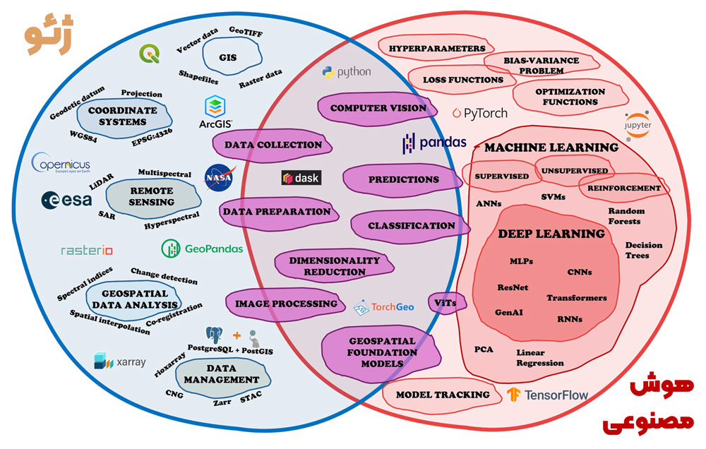 تصویر بالا بهصورت شماتیک نشان میدهد که GeoAI در واقع محل تلاقی سه حوزهی بزرگ است: