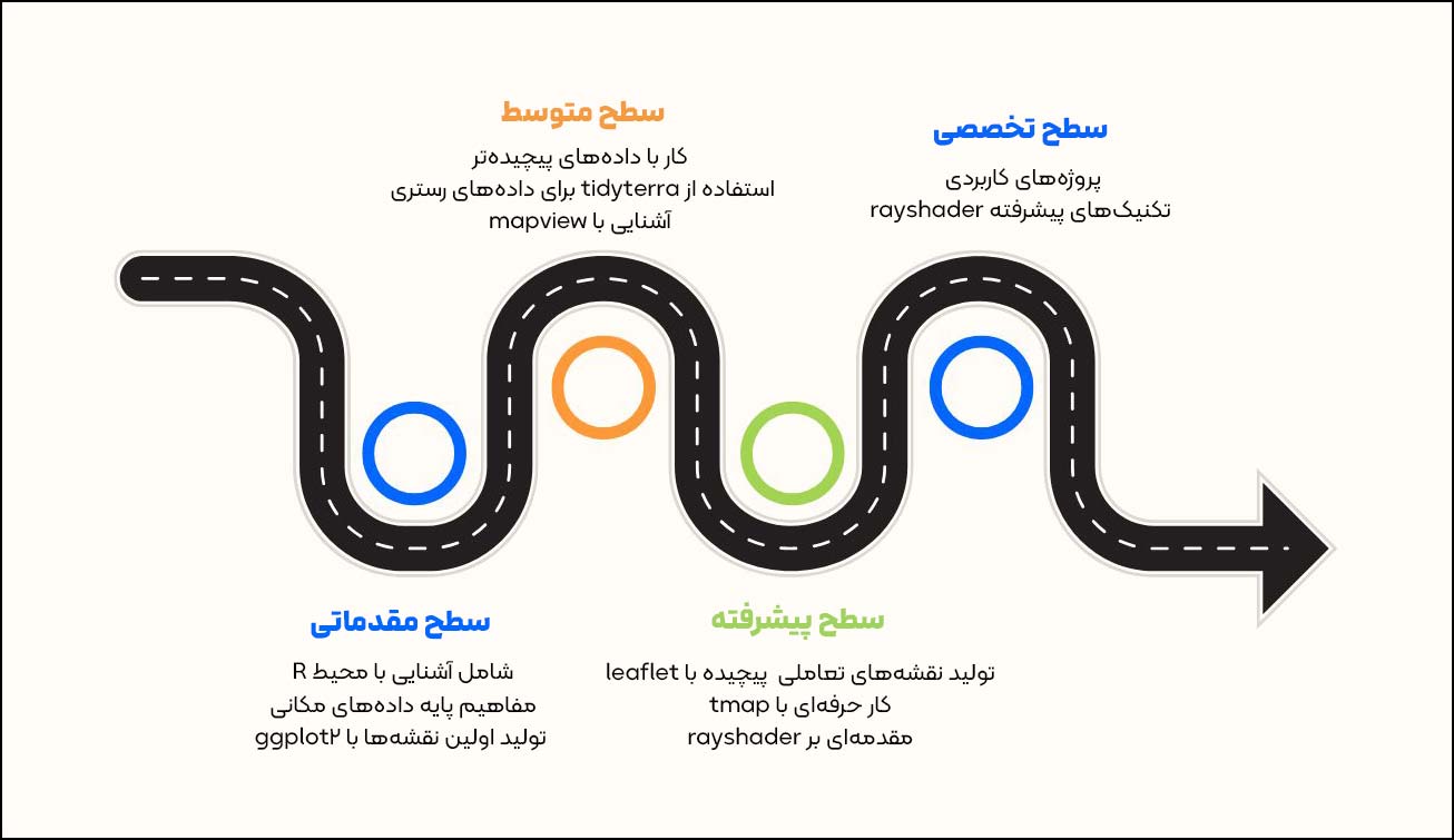 - سطح مقدماتی شامل آشنایی با محیط R، مفاهیم پایه دادههای مکانی و تولید اولین نقشهها با ggplot2 میباشد.